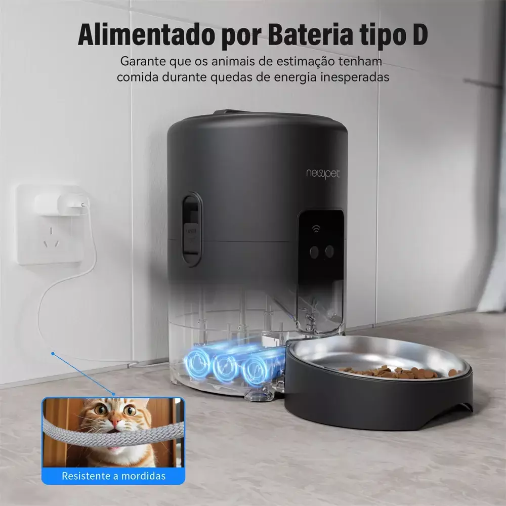 Dupla Fonte de Energia: Funciona ligado na tomada e possui um compartimento para pilhas (não inclusas) como backup de emergência. Em caso de falta de energia, o alimentador continua funcionando, garantindo que a rotina de alimentação não seja interrompida – paz de espírito total! 🔋